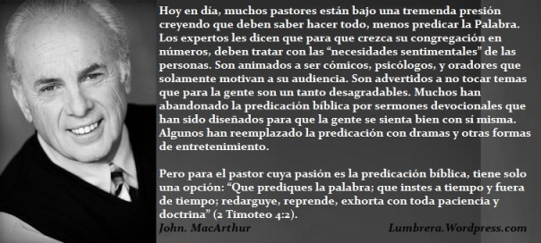 Hoy en día, muchos pastores están bajo una tremenda presión creyendo que deben saber hacer todo, menos predicar la Palabra. Los expertos les dicen que para que crezca su congregación en números, deben tratar con las “necesidades sentimentales” de las personas. Son animados a ser cómicos, psicólogos, y oradoresque solamente motivan a su audiencia. Son advertidos a no tocar temas que para la gente son un tanto desagradables. Muchos han abandonado la predicación bíblica por sermones devocionales que han sido diseñados para que la gente se sienta bien con sí misma. Algunos han reemplazado la predicación con dramas y otras formas de entretenimiento.