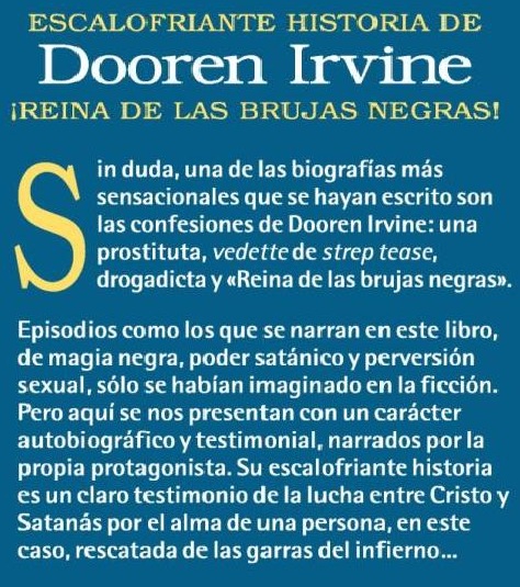 Esta NO ES la historia de Rebeca Brown (catalogada como un fraude). Este es OTRO CASO y las referencias se basan en la traduccion de la biografía de Dooren Irvinee “De la brujería a Cristo”, por el pastor Samuel Pérez Millos.