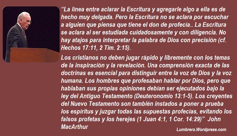 La línea entre aclarar la Escritura y agregarle algo a ella es de hecho muy delgada. Pero la Escritura no se aclara por escuchar a alguien que piensa que tiene el don de profecía.. La Escritura se aclara al ser estudiada cuidadosamente y con diligencia. No hay atajos para interpretar la palabra de Dios con precisión (cf. Hechos 17:11, 2 Tim. 2:15).