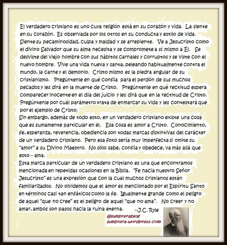 Esta marca particular de un verdadero cristiano es una que encontramos mencionada en repetidas ocasiones en la Biblia. “Fe hacia nuestro Señor Jesucristo” es una expresión que con la cual muchos cristianos están familiarizados. No olvidemos que el amor es mencionado por el Espíritu Santo en términos casi tan enfáticos como la fe. Igualmente grande como el peligro de aquel “que no cree” es el peligro de aquel “que no ama”. No creer y no amar, ambos son pasos hacia la ruina eterna.”