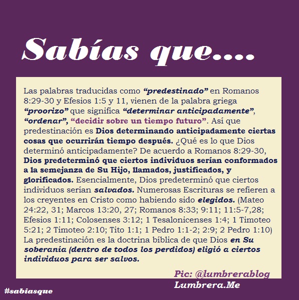Romanos 8:29-30 nos dice, “Porque a los que antes conoció, también los predestinó para que fuesen hechos conformes a la imagen de Su Hijo, para que Él sea el primogénito entre muchos hermanos. Y a los que predestinó, a éstos también llamó; y a los que llamó, a éstos también justificó; y a los que justificó, a éstos también glorificó.” Efesios 1:5 y 11 declaran, “… en amor habiéndonos predestinado para ser adoptados hijos suyos por medio de Jesucristo, según el puro afecto de Su voluntad…. En Él asimismo tuvimos herencia, habiendo sido predestinados conforme al propósito del que hace todas las cosas según el designio de Su voluntad.” Mucha gente tiene gran hostilidad hacia la doctrina de la predestinación. Sin embargo, la predestinación es una doctrina bíblica. La clave es entender lo que significa bíblicamente la predestinación.