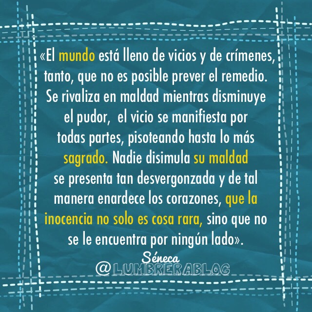 «El mundo -dijo Seneca-está lleno de vicios y de crímenes, tanto, que no es posible prever el remedio. Se rivaliza en maldad mientras disminuye el pudor, el vicio se manifiesta por todas partes, pisoteando hasta lo más sagrado. Nadie disimula su maldad se presenta tan desvergonzada y de tal manera enardece los corazones, que la inocencia no solo es cosa rara, sino que no se le encuentra por ningún lado» (16).