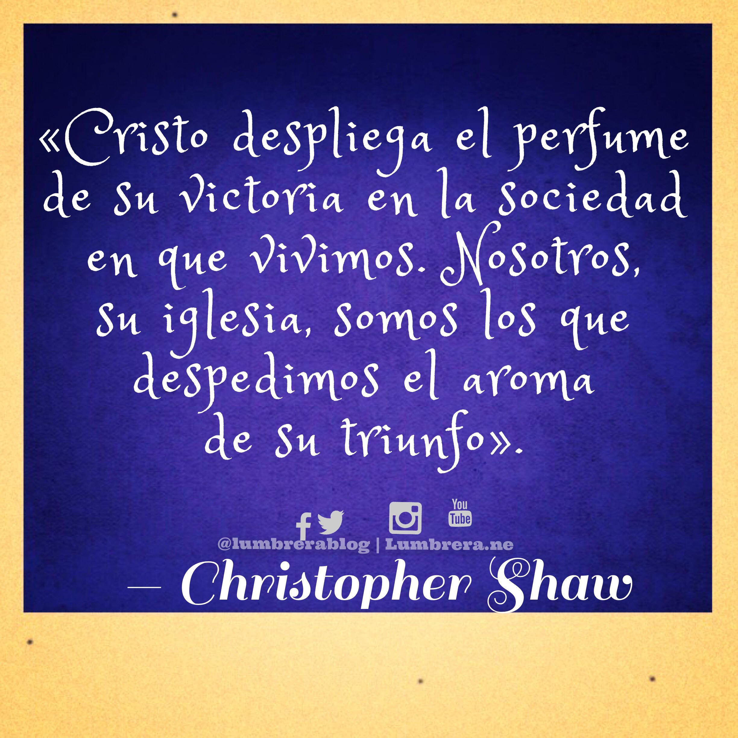 Del mismo modo, Cristo despliega el perfume de su victoria en la sociedad en que vivimos. Nosotros, su iglesia, somos los que despedimos el aroma de su triunfo. Algunos, percibiendo este dulce olor, encuentran al Cristo victorioso detrás de la vida de sus hijos. Para otros, sin embargo, la necedad de la cruz no significará otra cosa que el anuncio de su propia muerte espiritual. Sea cual sea la realidad, recae sobre nosotros ser testigos del triunfo de nuestro Señor. Despedimos perfume de cosas santas cuando escogemos vivir la clase de vida a la que hemos sido llamados. Es decir, logramos que otros vean al Mesías en nuestras palabras, nuestros gestos y actitudes, nuestro comportamiento y nuestras obras.