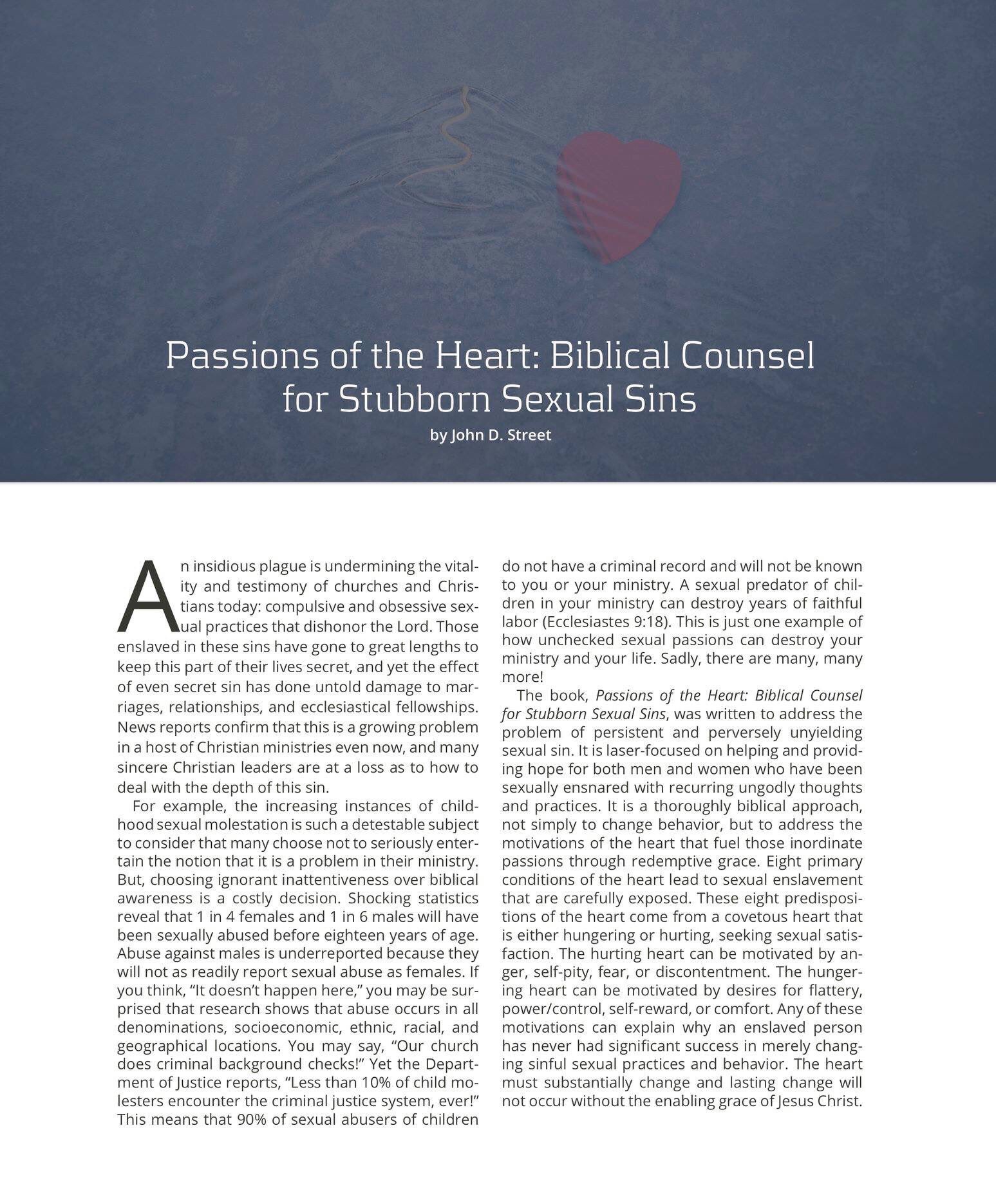 Una plaga insidiosa está socavando la vitalidad y el testimonio de las iglesias y los cristianos de hoy: prácticas sexuales compulsivas y obsesivas que deshonran al Señor. Aquellos esclavizados en estos pecados han hecho grandes esfuerzos para mantener en secreto esta parte de sus vidas, y sin embargo, el efecto de incluso el pecado secreto ha hecho un daño incalculable a los matrimonios, las relaciones y las comunidades eclesiásticas. Los informes de noticias confirman que este es un problema creciente en una serie de ministerios cristianos, incluso ahora, y muchos líderes cristianos sinceros no saben cómo lidiar con la profundidad de este pecado. Por ejemplo, los casos crecientes de abuso sexual infantil son un tema tan detestable que hay que considerar que muchos eligen no considerar seriamente la idea de que es un problema en su ministerio. Pero elegir una falta de atención ignorante sobre la conciencia bíblica es una decisión costosa. Las estadísticas impactantes revelan que 1 de cada 4 mujeres y 1 de cada 6 hombres habrán sido abusados sexualmente antes de cumplir los dieciocho años. El abuso contra los hombres no es denunciado porque no informarán tan fácilmente el abuso sexual como las mujeres. Si piensa: “No sucede aquí”, es posible que se sorprenda de que la investigación muestre que el abuso ocurre en todas las denominaciones, ubicaciones socioeconómicas, étnicas, raciales y geográficas. Puedes decir: “¡Nuestra iglesia hace verificaciones de antecedentes penales!” Sin embargo, el Departamento de Justicia informa: “¡Menos del 10% de los criminales infantiles se encuentran con el sistema de justicia penal, alguna vez!” Esto significa que el 90% de los abusadores sexuales de niños no tienen antecedentes penales y usted o su ministerio no los conocerán. Un depredador sexual de niños en su ministerio puede destruir años de trabajo fiel (Eclesiastés 9:18). Este es solo un ejemplo de cómo las pasiones sexuales no controladas pueden destruir su ministerio y su vida. Lamentablemente, hay muchos, muchos más! El libro, Pasiones del corazón: Consejo bíblico para los pecados sexuales obstinados, fue escrito para abordar el problema del pecado sexual persistente y perversamente implacable. Está enfocado en el láser en ayudar y brindar esperanza tanto a hombres como a mujeres que han sido atrapados sexualmente con pensamientos y prácticas impías recurrentes. Es un enfoque completamente bíblico, no solo para cambiar el comportamiento, sino para abordar las motivaciones del corazón que alimentan esas pasiones desmedidas a través de la gracia redentora. Ocho condiciones primarias del corazón conducen a la esclavitud sexual que se exponen cuidadosamente. Estas ocho predisposiciones del corazón provienen de un corazón codicioso que está hambriento o herido, buscando satisfacción sexual. El corazón herido puede ser motivado por el malestar, la autocompasión, el miedo o el descontento. El corazón hambriento puede ser motivado por deseos de poder/control de la adulación, auto recompensa o comodidad. Cualquiera de estas motivaciones puede explicar por qué una persona esclavizada nunca ha tenido un éxito significativo en el mero cambio de prácticas y comportamientos sexuales pecaminosos. El corazón debe cambiar sustancialmente y el cambio duradero no se producirá sin la gracia habilitadora de Jesucristo.
