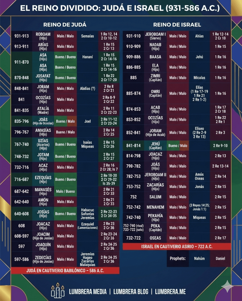 Espero que esta guía y el cuadro te ayuden a desenredar la confusa cantidad de nombres similares entre los reinos de Israel y Judá en 1 y 2 Reyes, y a comprender mejor la historia del pueblo escogido de Dios según las Escrituras. La próxima vez que alguien te pregunte cuál es tu rey favorito de Judá, ¡ya tendrás respuesta preparada!